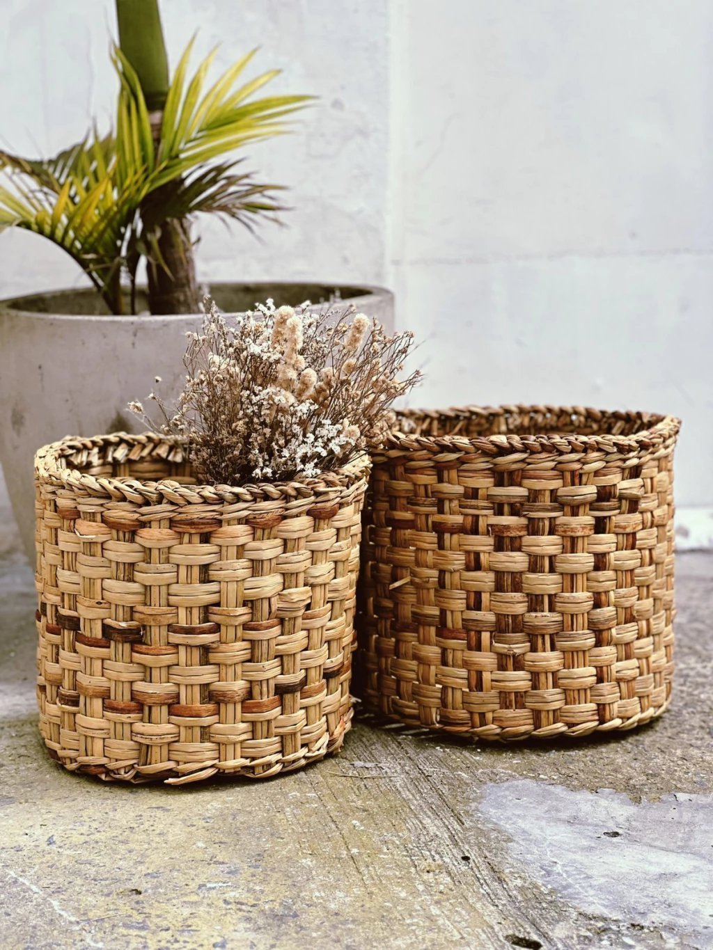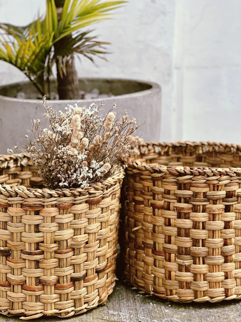 CESTO EN JUNCO SET X 2 Este set incluye dos cestos artesanales en junco, uno chico y uno grande, ideales para organización y decoración.
