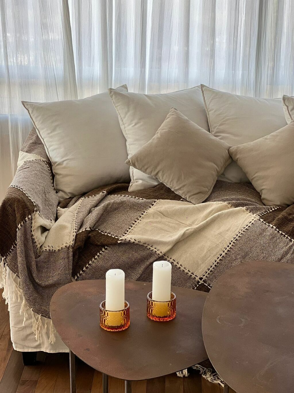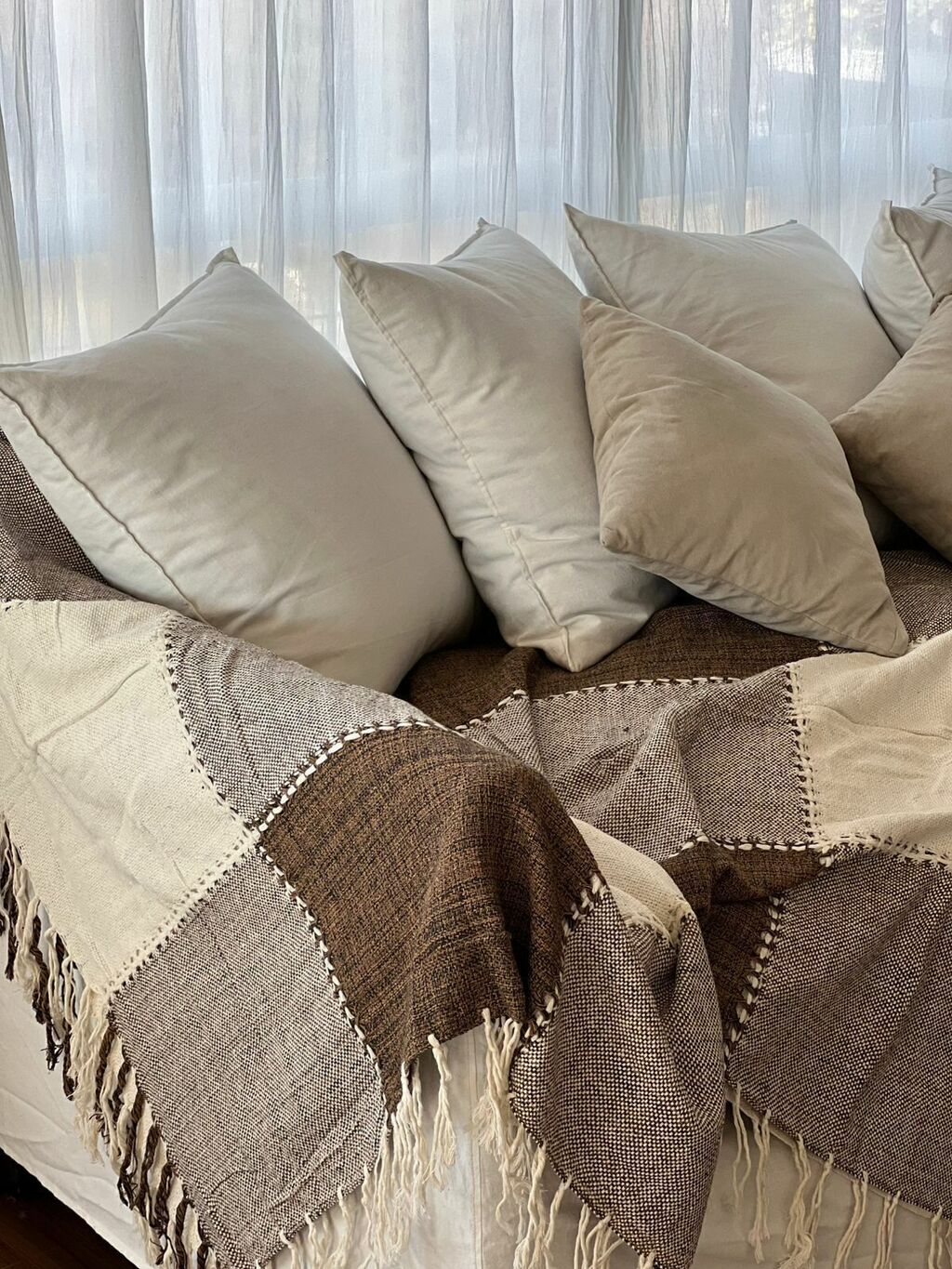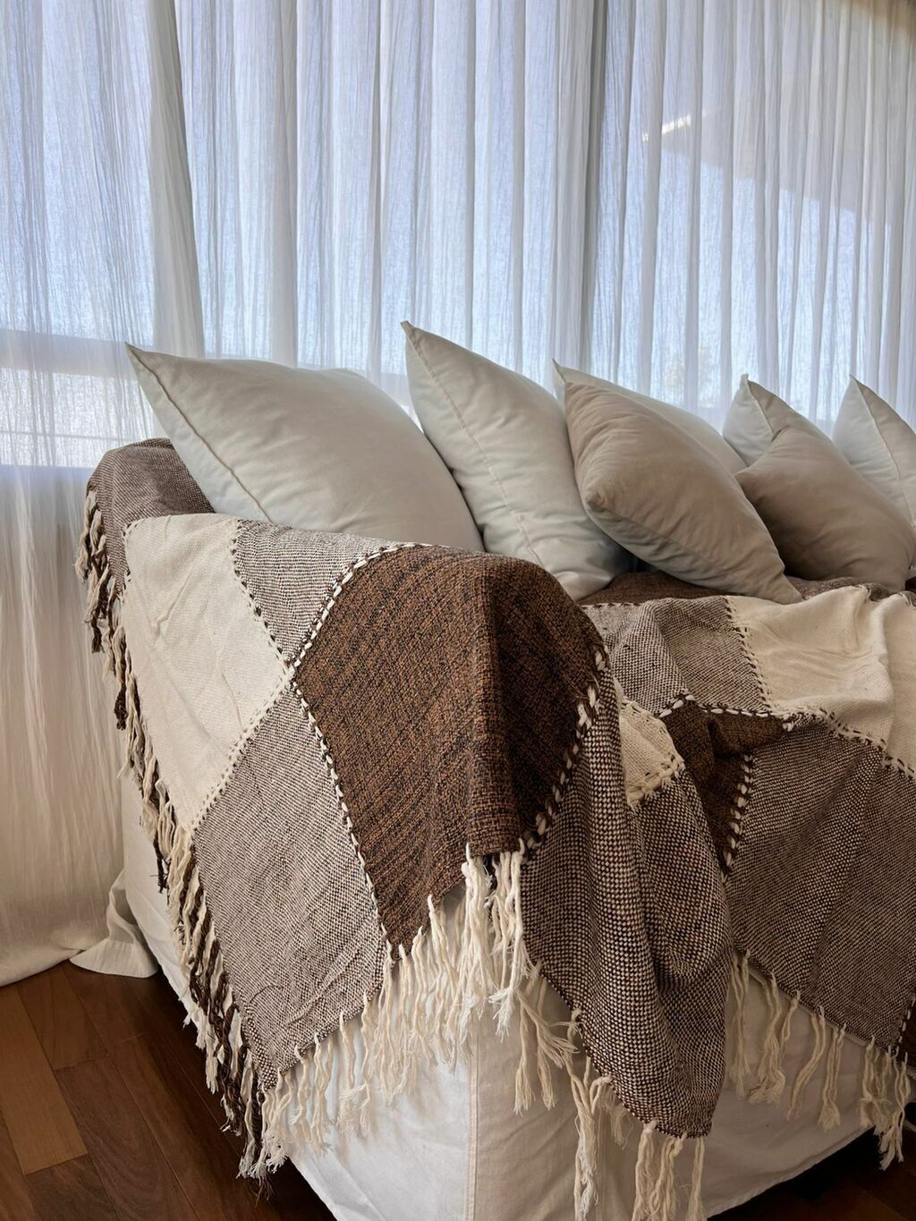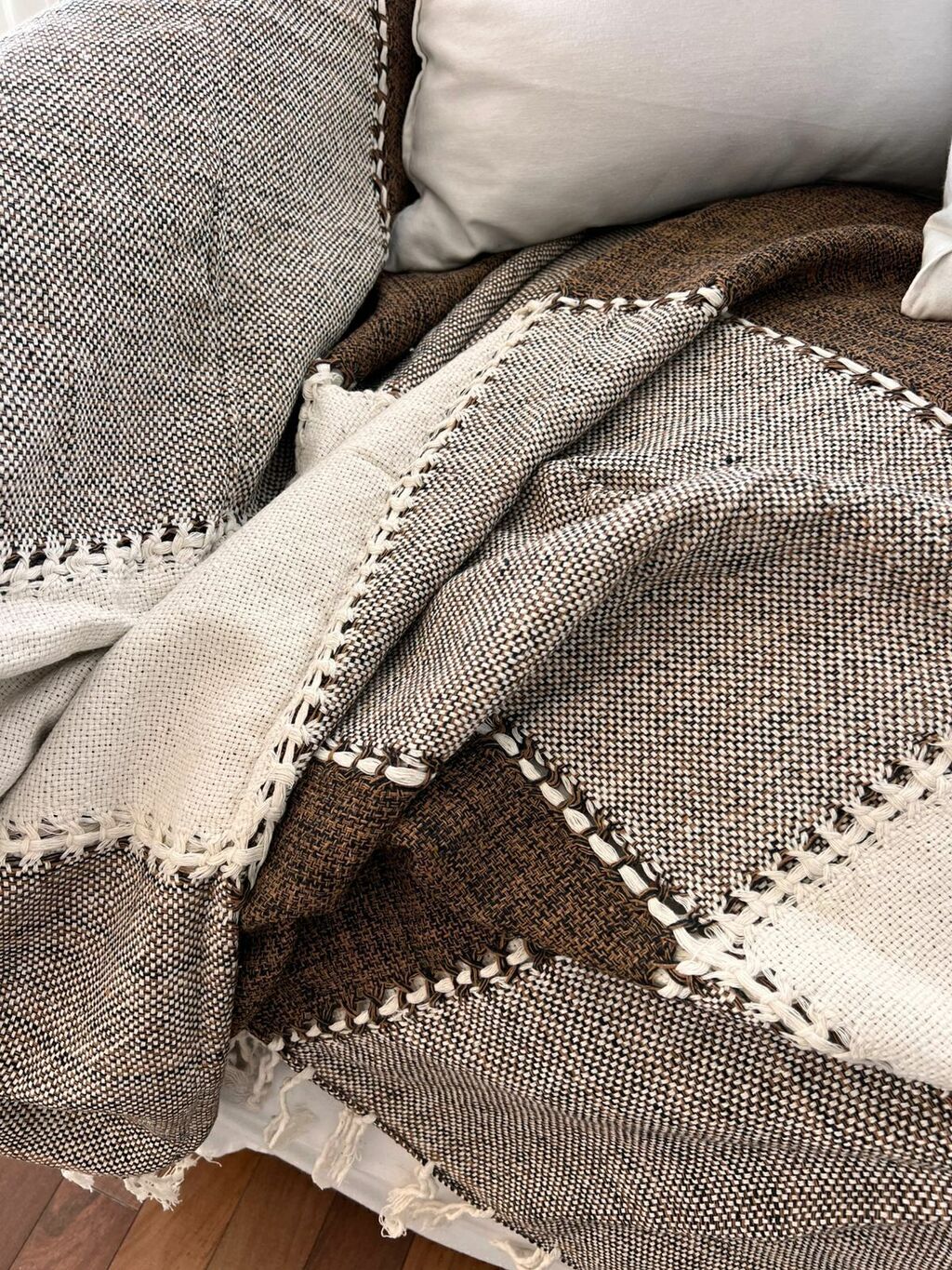 Confeccionada artesanalmente en 100% ALGODON. Es pesada e ideal para usar como pie de cama o manta para sillón. Aporta calidez y estilo a tu hogar.