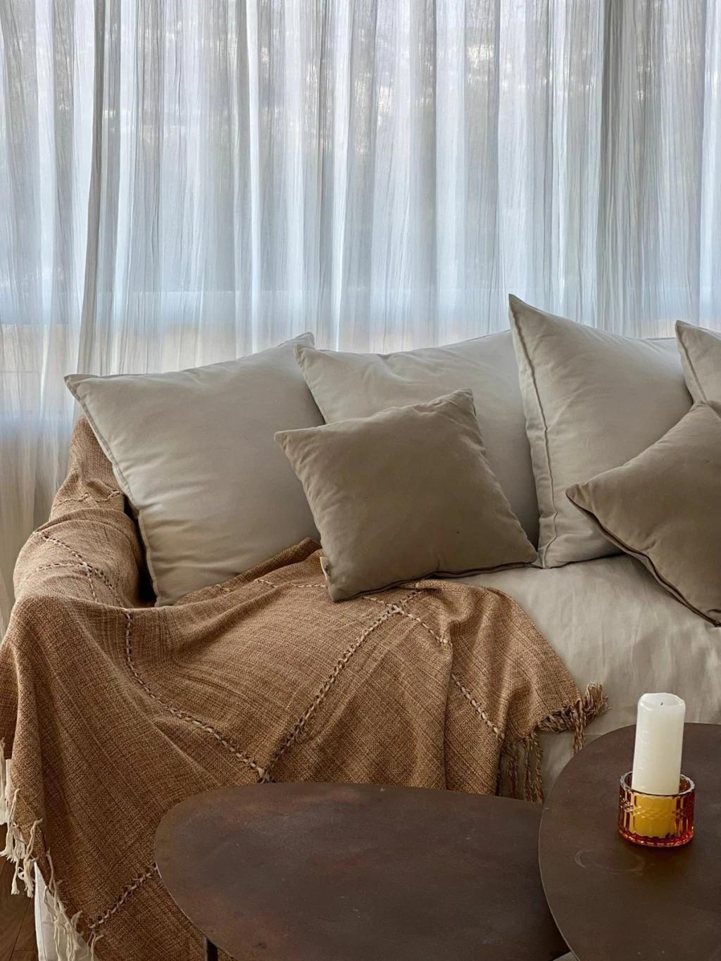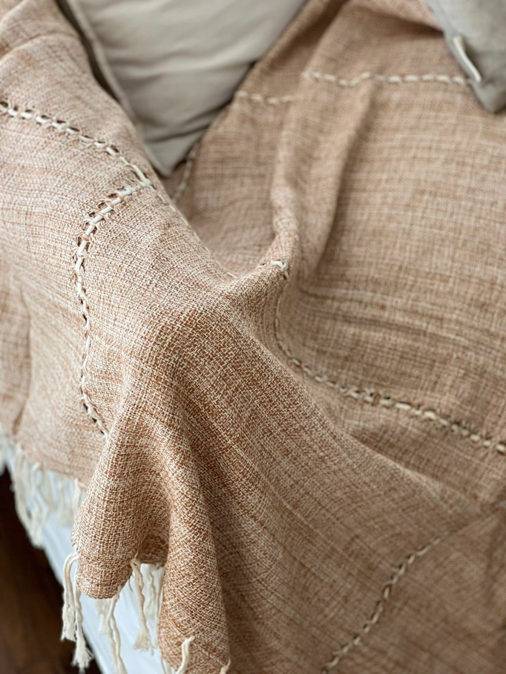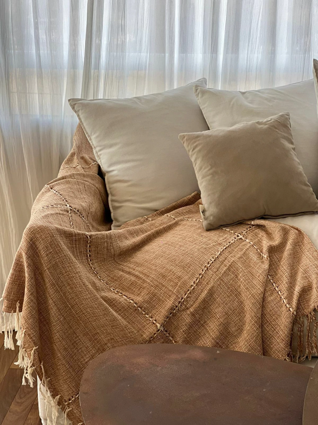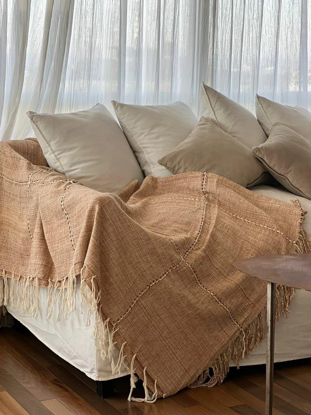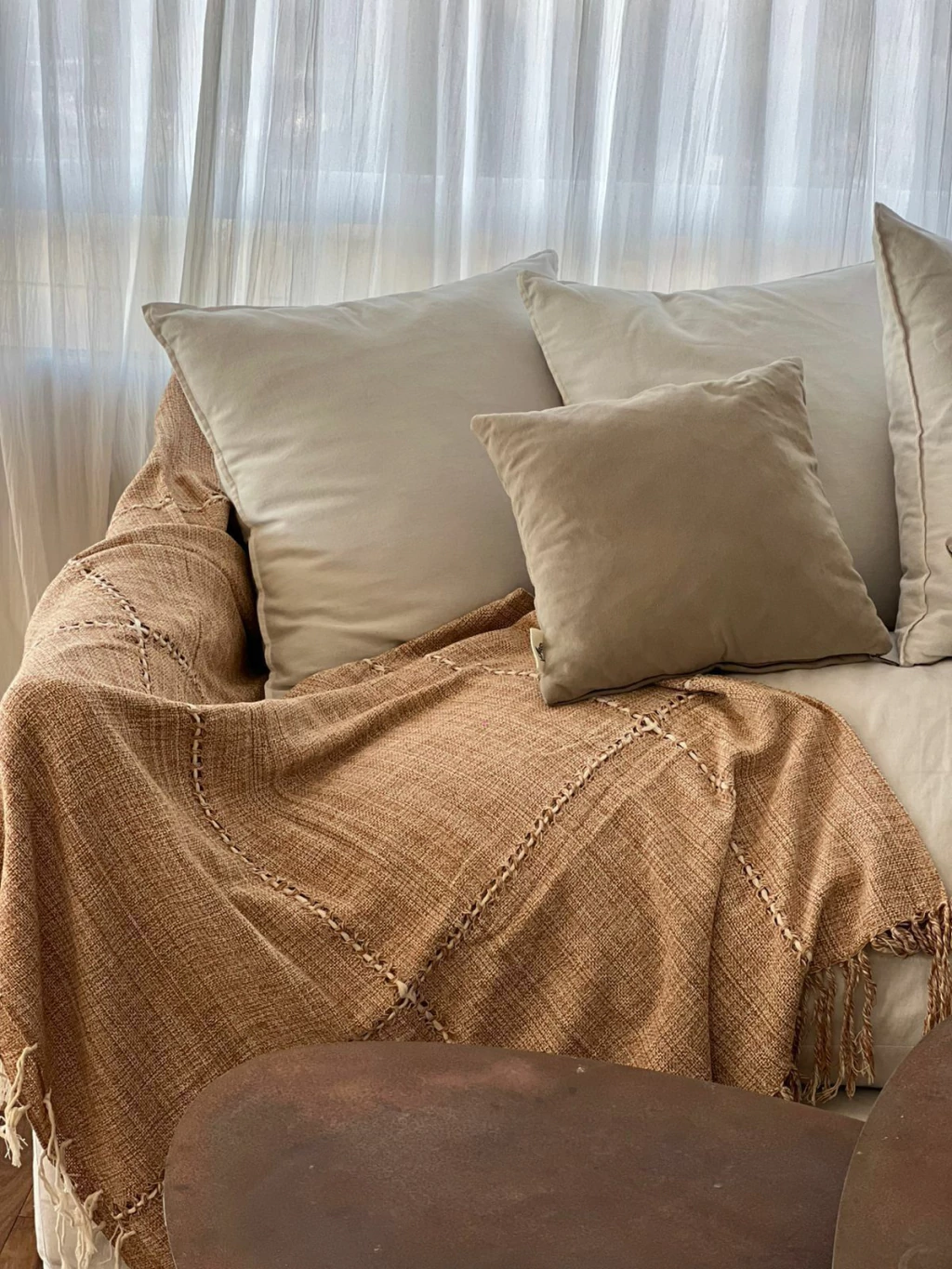 Confeccionada artesanalmente en 100% ALGODON. Es pesada e ideal para usar como pie de cama o manta para sillón. Aporta calidez y estilo a tu hogar.
